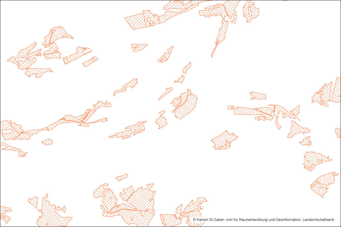 Die Karte zeigt alle Flächen im Kanton St. Gallen, auf denen flüssiger Hofdünger grundsätzlich mit emissionsmindernden Verfahren ausgebracht werden muss. Ausserkantonal bewirtschaftete Flächen werden auch abgebildet.